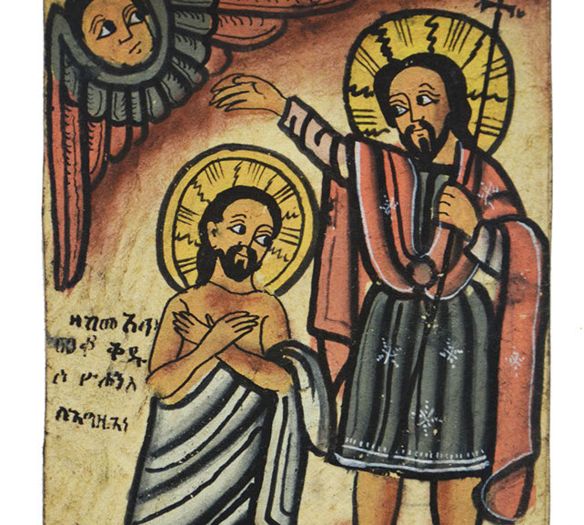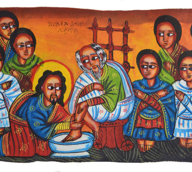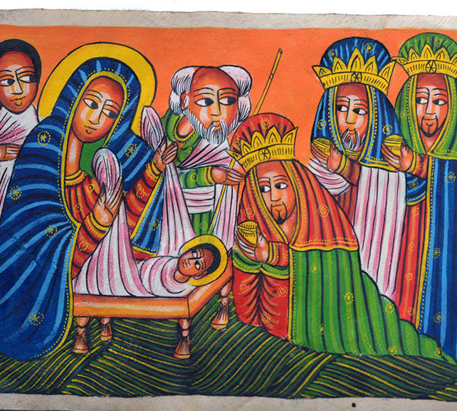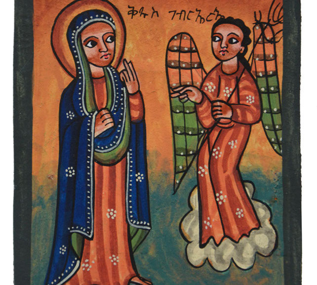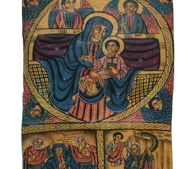 The purpose of Ethiopian art is use color to portray the drama of the Gospels. These icons are made of wood or leather panels, and are used as personal altars. From the Annunciation to the Wisemen at the Nativity, Christ’s Baptism, The Wedding at Cana through the many events of his Passion, the Ethiopian artist has focused on the life of Jesus.