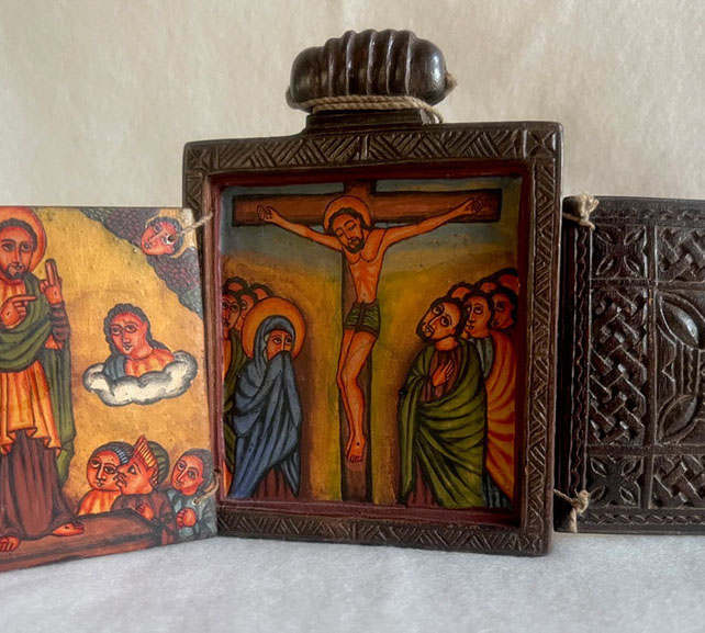 Most of the pieces in the show are the work of Ethiopian artists and artisans from the last thirty to fifty years, who carry on ancient forms of sacred art-making in the modern era. They include hammered metal processional and pectoral crosses, folding icons, and leather and parchment paintings on biblical themes in the style of traditional Ethiopian illuminated manuscript art. One of the highlights of the show is a hundred year old painting on leather of the Virgin Mary and Her Beloved Son surrounded by stories from the life of Jesus.