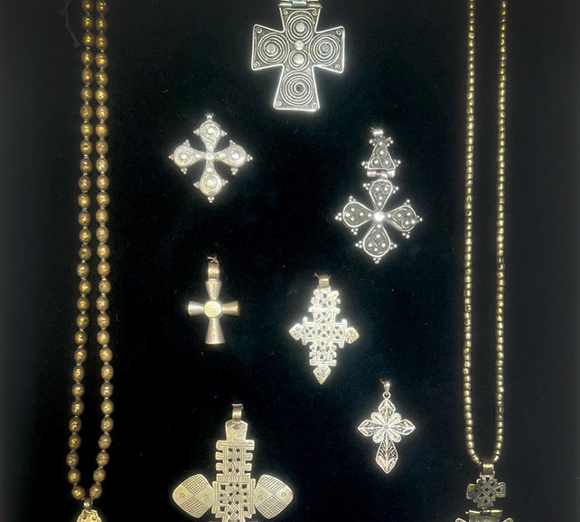 When thinking of Ethiopian art it would be impossible not to mention the array of crosses that dominate their culture. Nowhere in the world has the cross been proliferated in so many ways as in Ethiopia. As seen in this exhibition there are large elaborately designed processional crosses mounted on poles, many in metals, but some in wood, to be used in public worship. For over 1,600 years Ethiopians have worn pendants or neck crosses, many times given at baptism and worn as evidence of the faith. Still other crosses were worn by priests and pilgrims during religious processions.