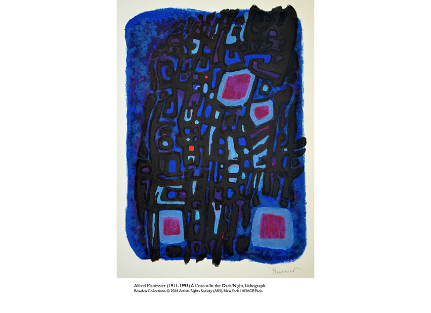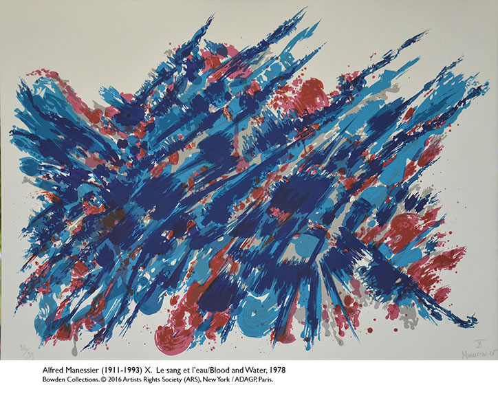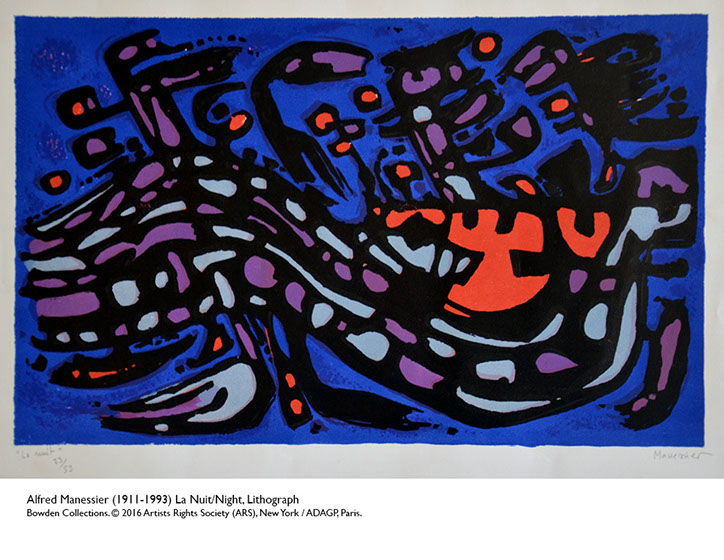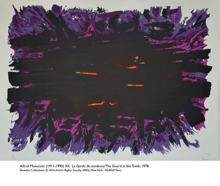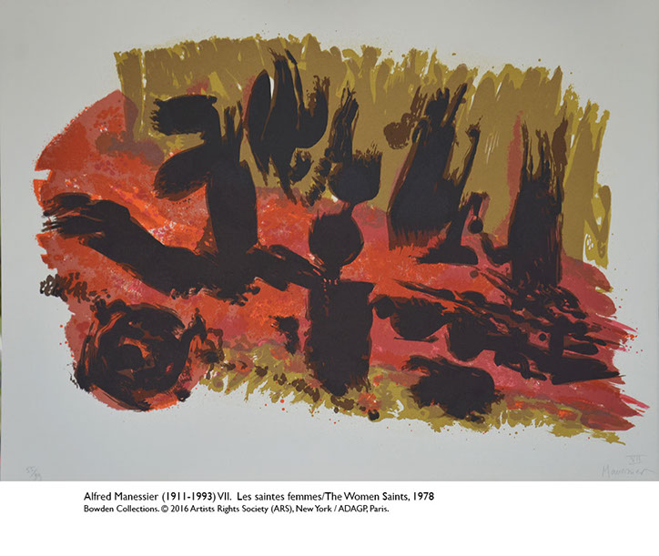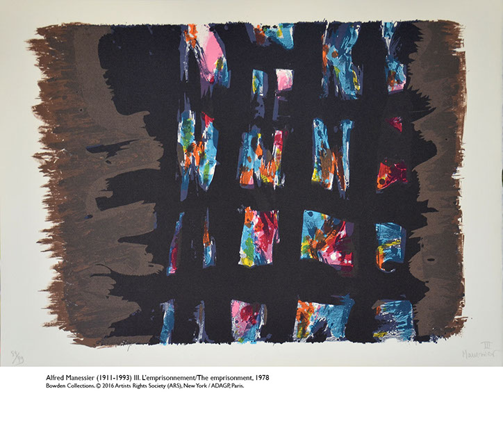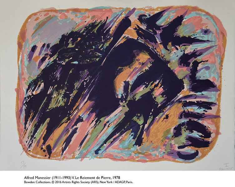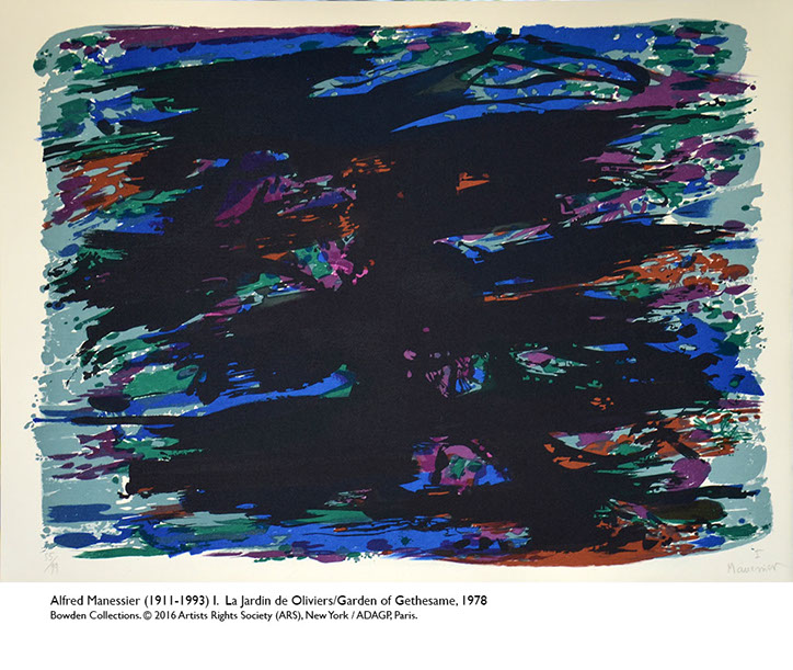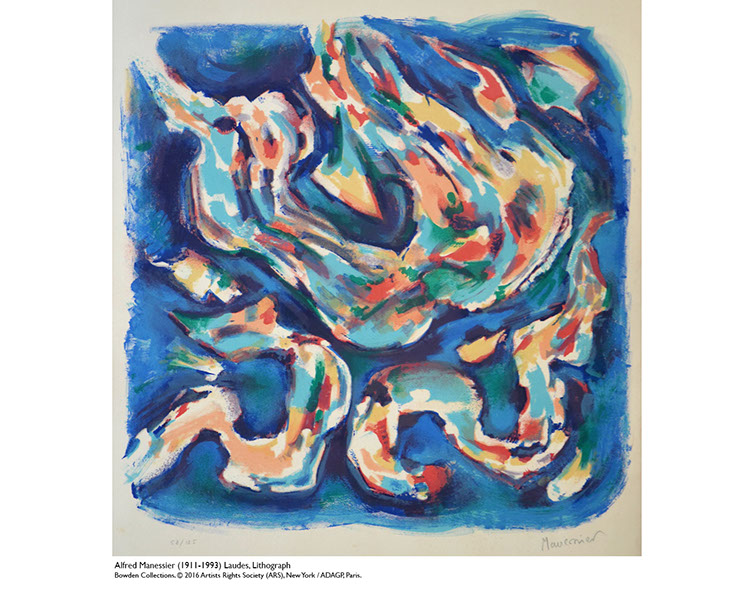 Alfred Manessier is a non-figurative French painter and stained glass maker of sacred art from the last half of the twentieth century and was associated with the Lyrical Abstraction movement after the Second World War. He is also known for his vibrantly colored lithographs many of which are in this exhibition.