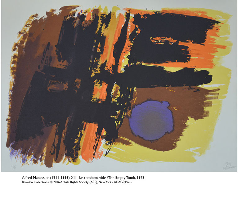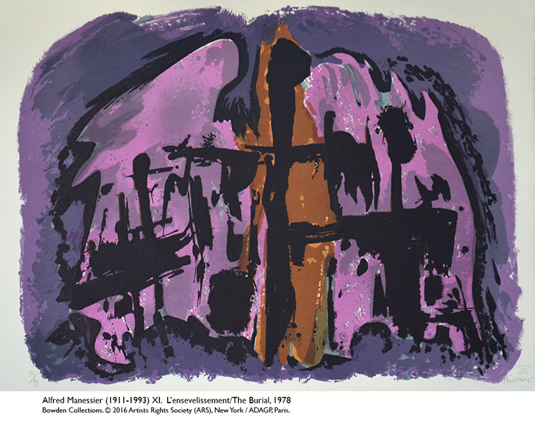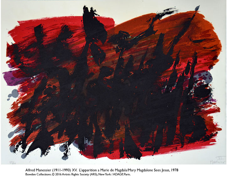 Manessier created several lithographic cycles that relate to the biblical narrative of Easter. His 1978 Suite de Pâques is a series of 15 abstract images, many consisting of luminous color radiating from beneath dark latticed patterns. The series begins with Jardin des Oliviers, Envisons l’arrestation de Jesu in the deep colors of night, bursts with intense reds and purples in Les Tortures, and then depicts La montee au calvaire and Le crucifiement with the symbol of the cross. The last half of the series has lighter, more celebratory tones as we approach Le tombeau vide (the empty tomb), Le message de l’ange and the L’apparition a Marie de Magdala.