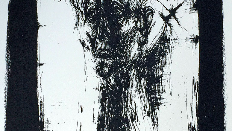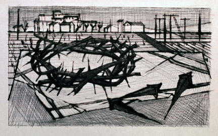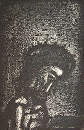 “But Pilate answered, ‘You take him and crucify him. As for me, I find no basis for a charge against him.’” Pilate, whether from fear or self-preservation, declared that although he found no basis for the death of Jesus, he would hand him over to be crucified. The mid-century lithograph by a Hemlut Dietrich looks directly into the face of Jesus. Graphic lines obscure the face, reflecting the viewer’s inability to see the Savior of the World in such pain.