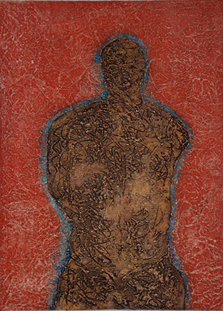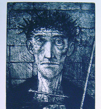 In the tradition of their predecessors the 20th century French artists, Michel Ciry and Georges Rouault, portray Christ bare-chested with a robe slung over his shoulders. Christ was crowned with thorns and clothed with a purple robe in a defiant and hostile way.