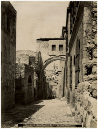 The earliest depictions of the Ecce Homo scene appear in the ninth and tenth centuries in the Syrian-Byzantine art. Many high-ranking Jewish officials attended the questioning of Jesus, but to remain ceremonially clean, they did not wish to enter the house of the Roman ruler. Therefore, historians believe Pilate had to bring Jesus outside of his house to present him to the crowd. The early Syrian-Byzantine artists often pictured Jesus, crowned in thorns and wearing a purple robe outside of Pilate’s palace. Bonfils’ photograph, Ecce Homo, provides the physical setting on the Jerusalem street where this took place over 2000 years ago just inside the St. Stephen’s Gate.