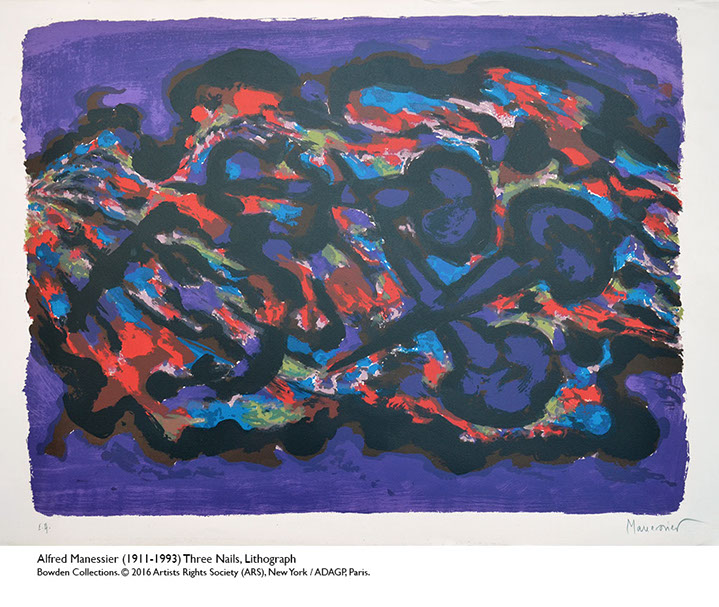 Alfred Manessier is a non-figurative French painter and stained glass maker of sacred art from the last half of the twentieth century and was associated with the Lyrical Abstraction movement after the Second World War. He is also known for his vibrantly colored lithographs many of which are in this exhibition.