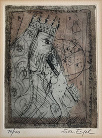 This etching and aquatint of King David and His Harp depicts a musician totally absorbed as he plays and sings a psalm. Amen was a prolific artist who worked in oils and various printing techniques. Most of his subjects were biblical characters and studies of people.