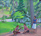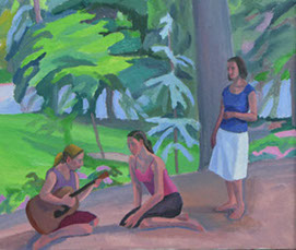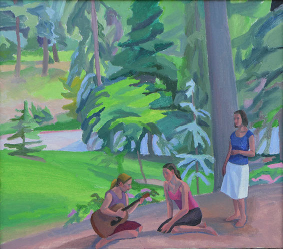 Music-making in a pastoral setting traditionally evokes the idea of humanity in harmony with God’s good creation, an echo of Eden. Highland Park, Rochester, NY, was designed by Frederick Law Olmsted with these reflections in mind. The figures included her are family members adding some emotional weight to the landscape.