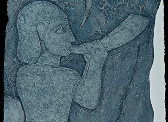 The Greek passage from Revelations 4 known as the Sanctus: "Holy, Holy, Holy, is the Lord, God Almighty, who was, and who is, and who is to come," and Benjamin Britten’s Sanctus exchange voices in this mixed media collagraph.
