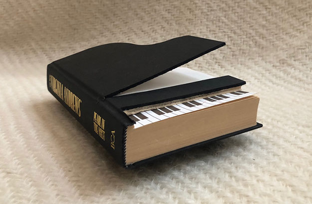 This English artist cleverly cut the pages of a book to form a grand piano with the black cover of becoming the lid of the instrument.