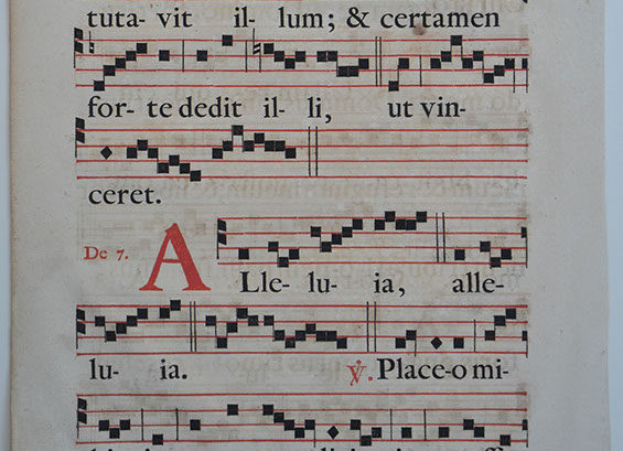 This illuminated music manuscript was created using paper so dates later than those on vellum. The text is from the Vulgate that was the liturgical language of the church.