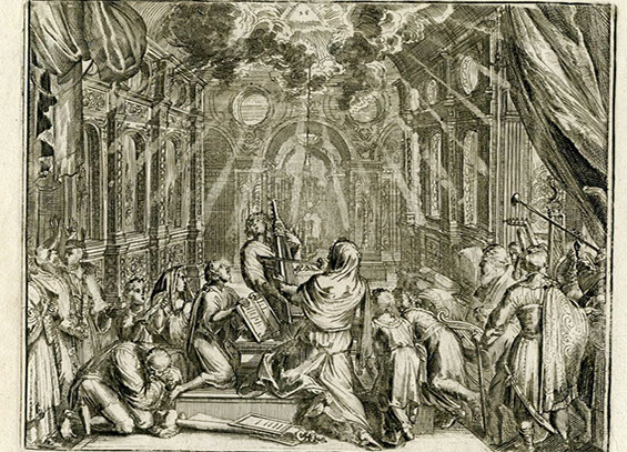 This small, wonderful engraving from the Dutch Golden Age, showing voices and instruments, led by the prophet Habakkuk, making music to God (represented by the pyramid form, top center). Music history mavens will be interested to note that the prophet is leading the ensemble with a baton, like a modern orchestral conductor. Everyone seems to be having a fine time. The two lads to the right of Habakkuk seem to be sharing a private joke. There is lots to look at and enjoy in this picture.