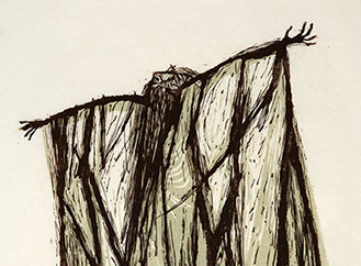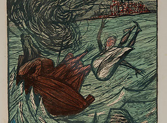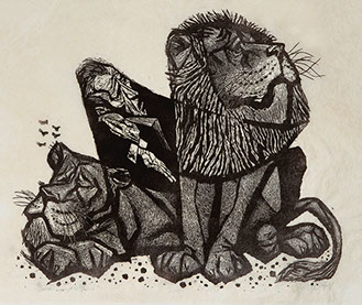 He has given us many dramatic linocuts of Old Testament characters such as Jonah being cast from the boat during a tumultuous storm, the Psalm Singer exuberantly dancing, and Daniel in the Lion’s Den crushed between two huge, but seemingly docile beasts.