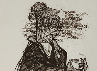 His linocuts are infused with wit and satire as demonstrated in his Social/Satire Series, none more poignantly than his Sermon, where the preacher has streams of words, words, words issuing from his mouth as he stands preaching from the pulpit.