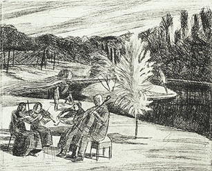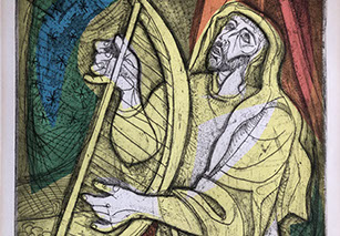 Nissen Engel was born in Israel but moved to New York City in 1965. He had an intimate acquaintance with the Scriptures. This delicate etching invites us to envision David playing a flute or wind instrument, perhaps recalling the times he spent time making music alone in the fields as he watched over his father’s sheep.