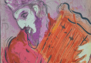 David was a writer and musician, composing major parts of the Psalms. Chagall portrayed David with a harp that he knew how to play ingeniously. His face is glowing in white, which is a sign for enlightenment, bestowed by God? The purple background symbolizes the presence of God, the King and leader of Israel.