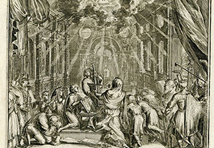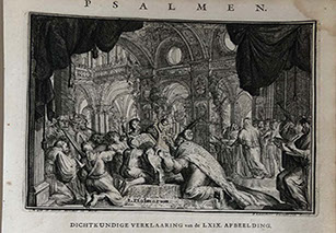 It is impossible to imagine the church without music. The monastic tradition used Gregorian chant and choral singing to enhance worship as seen in the elaborate Bifolium Antiphonal Leaves that a choir used in the 16th and 17th century. De Hooghe’s 18th engraving of the title page to the book of Psalms shows how the Dutch imagined music in biblical times. Not only the church, but also the Jewish community applauds music’s significance as seen in Rosenstein’s serigraph, Sing to the Lord a New Song and Marc Chagall’s two lithographs, one of David playing the harp and the other of an angel with a horn .