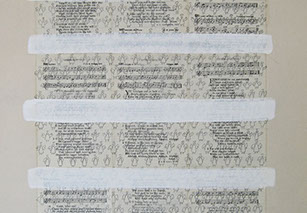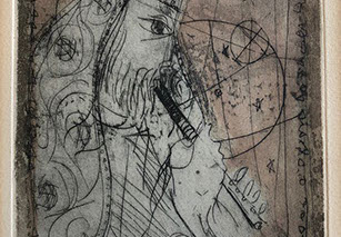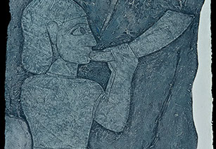 The Greek passage from Revelations 4 known as the Sanctus: "Holy, Holy, Holy, is the Lord, God Almighty, who was, and who is, and who is to come," and Benjamin Britten’s Sanctus exchange voices in this mixed media collagraph.