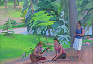 Music-making in a pastoral setting traditionally evokes the idea of humanity in harmony with God’s good creation, an echo of Eden. Highland Park, Rochester, NY, was designed by Frederick Law Olmsted with these reflections in mind. The figures included her are family members adding some emotional weight to the landscape.