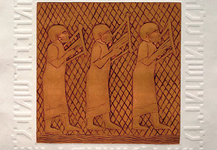 This collagraph uses an image found in Carchamesh of an 8th or 9th century BCE Hittite horn player.