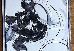 Knippers swiftly sketched pen and ink drawing recalls 1 Corinthians 15:52... In a moment, in the twinkling of an eye, at the last trump: for the trumpet shall sound, and the dead shall be raised ...