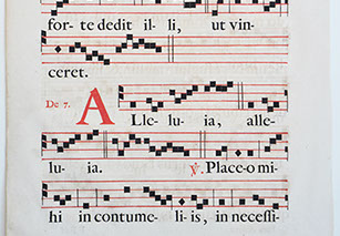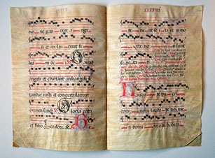 Before the 15th century western music was written by hand and preserved in manuscripts, usually bound in large volumes. This striking and rare bifolium (two adjoining leaves) of musical score in Latin lyrics is from a Spanish Antiphonary. Since there was no commercially printed music, these choir books were placed on a large music stand while the choir stood in a semi-circle singing from the score.