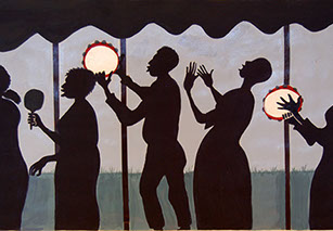 Barbara Zuber’s depiction of a local tent meeting near Albany, NY, celebrates the vibrant black tradition of dancing and singing with jubilation and joy…all join in the song. Barbara is a Black American and was trained as an artist at Yale University.