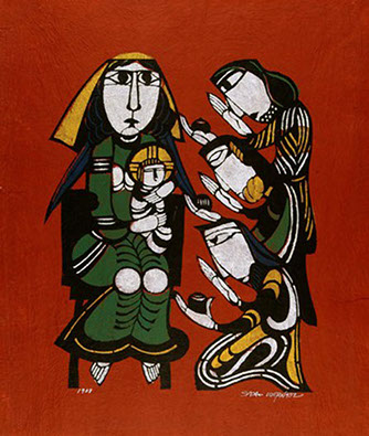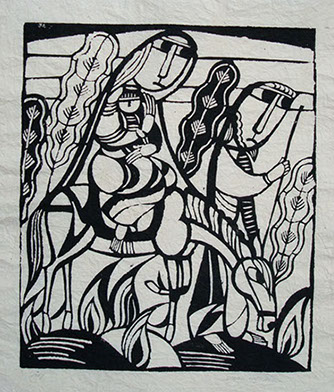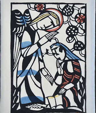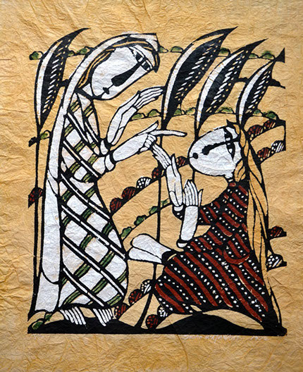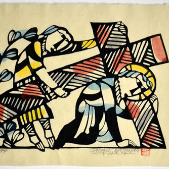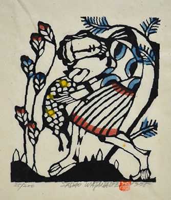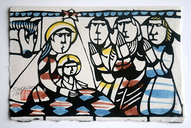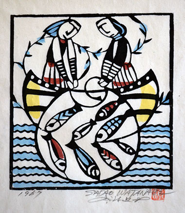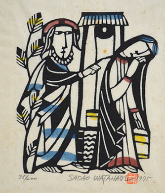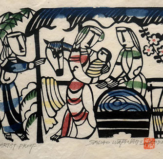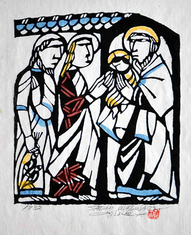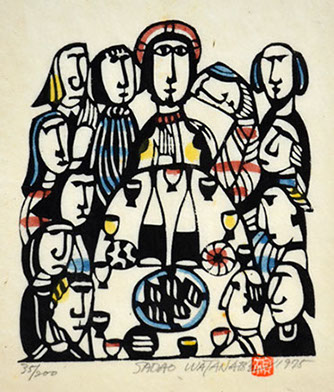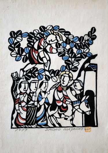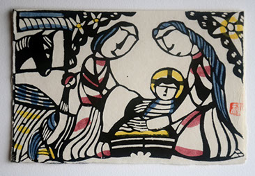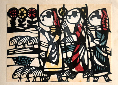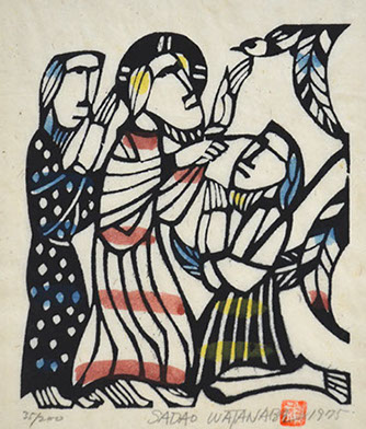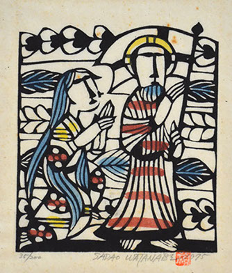 Japan’s foremost Christian artist, Sadao Watanabe (1913-1996) converted from Buddhism to Christianity at 17 years old. He soon combined his new faith with an interest in preserving the traditional Japanese folk art of stencil dying, or katazome, by creating colorful representation of biblical scenes that he hoped would speak to his people. He said, ‘My task is to stand within the artistic tradition of Japan…Theology will not take deep root in Japanese soil if it is merely an import.”