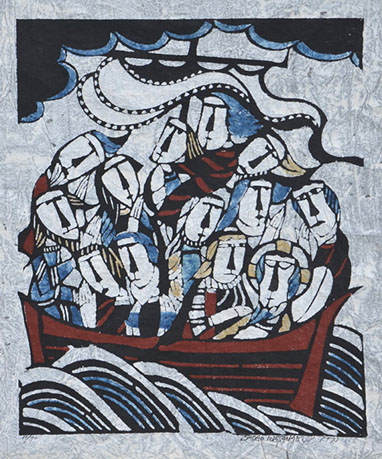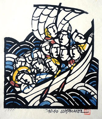 Within the framework of his Christian faith he was able to translate the biblical narratives into Japanese settings, thereby giving them broad resonance. Each hand cut print has been created using a complicated traditional stencil art form formally used for dying kimonos. He clothed all the biblical characters in the Japanese dress of kimonos. Noah’s Ark looks like a Japanese cricket cage filled with a menagerie of animals. He depicted the Last Supper with a spread of fish and sake, and the Wedding at Cana with a declawed lobster—all familiar traditional foods of his people.