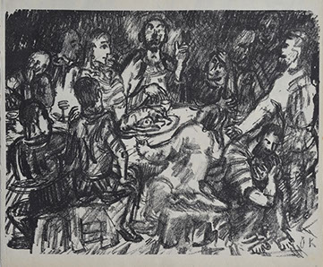 This exhibition takes the viewer on a journey through Scripture beginning with an engraving of Melchizedek serving Abraham bread and wine, continues with a Russian icon of Abraham entertaining angels, as well as a painting by Bernard Gussow of the Passover Meal. The New Testament is no less filled with His people eating together: The Wedding at Cana, Feeding of the Five Thousand, The Last Supper and the Supper at Emmaus. All are represented in this exhibition.