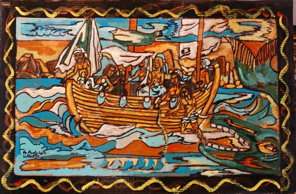 Cardboard Chronicles begins with The Creation of Adam, Adam and Eve Naming the Animals and Midnight in the Garden of Good and Evil, then turns to the colorful story of Noah. Many of his paintings portray the life of Christ. Comforting Mary (Annunciation) begins this journey, and Nativity with Angel portrays the incarnation of the Lord. Peace Be Still is a stunning interpretation of his encounter on the Sea of Galilee with his disciples, and The Last Supper is a real testimony to the influence of historical art on Bostic’s work. The show includes images of the death of Christ; Crucifixion, Pietà, and Lamentation/Two Women at Jesus’ Death. Angels Receive Orders from Jesus offers us the finale to Cardboard Chronicles: The Biblical Art of Rudolph Bostic.