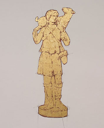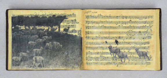 Then there is the series of artist’s books that act as boxes, using Biblical text to illustrate such things as the pearl of great price (a small box filled with real pearls) and “Even the Stones”, a gold-leaf covered box full of stones; and a book with nails glued on the cover. Her series of crucifixion portraits of Christ likewise employ real nails. “The Art of Sandra Bowden,” tells the story of a bereaved woman whose brother had died in an accident, who wrote to let Bowden know what comfort one of those paintings had given her.