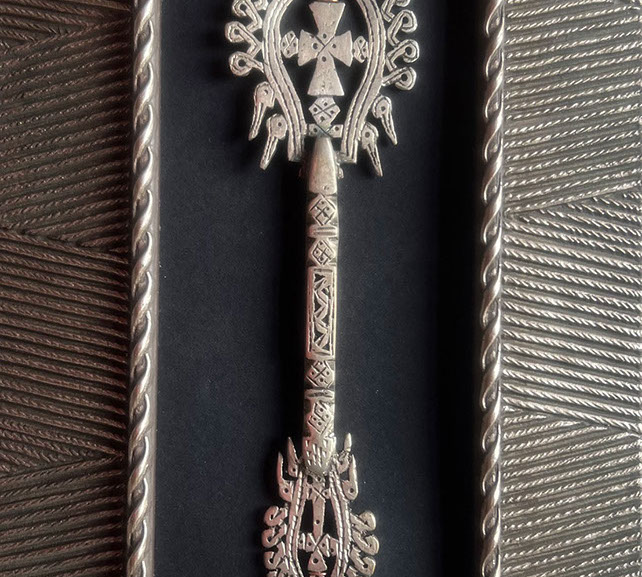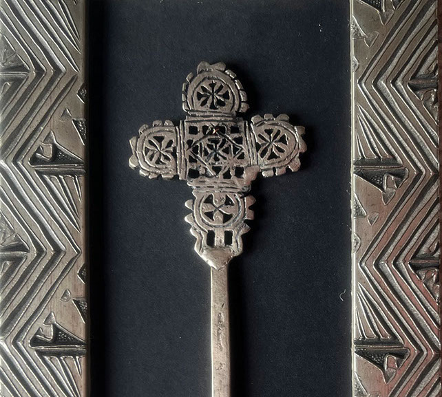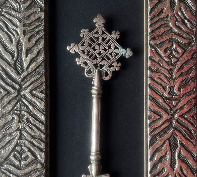 When thinking of Ethiopian art it would be impossible not to mention the array of crosses that dominate their culture. Nowhere in the world has the cross been proliferated in so many ways as in Ethiopia. As seen in this exhibition there are large elaborately designed processional crosses mounted on poles, many in metals, but some in wood, to be used in public worship. For over 1,600 years Ethiopians have worn pendants or neck crosses, many times given at baptism and worn as evidence of the faith. Still other crosses were worn by priests and pilgrims during religious processions.