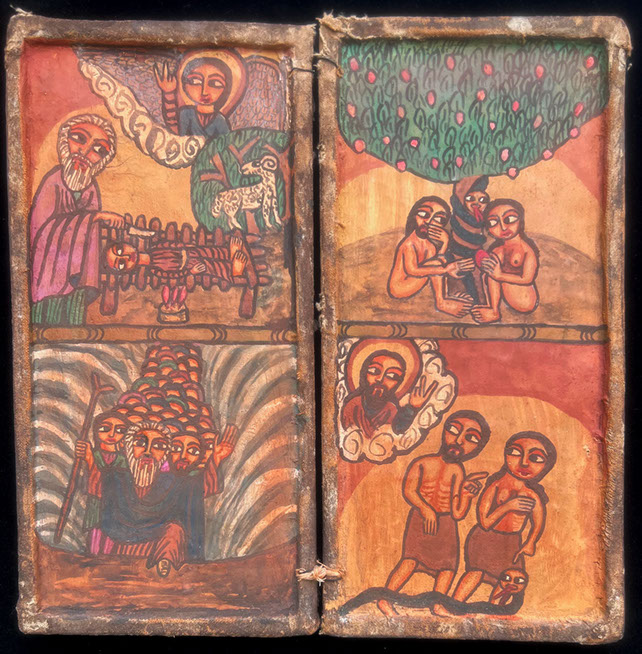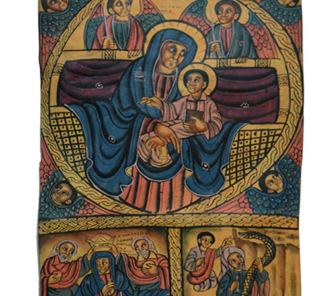 Most of the pieces in the show are the work of Ethiopian artists and artisans from the last thirty to fifty years, who carry on ancient forms of sacred art-making in the modern era. They include hammered metal processional and pectoral crosses, folding icons, and leather and parchment paintings on biblical themes in the style of traditional Ethiopian illuminated manuscript art. One of the highlights of the show is a hundred year old painting on leather of the Virgin Mary and Her Beloved Son surrounded by stories from the life of Jesus.