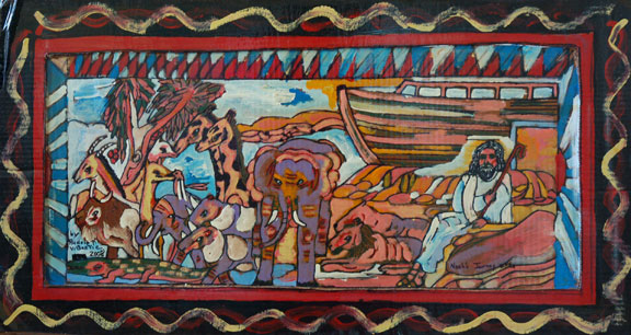 In route to the chapel, I led them through our Hallway Gallery. In the Hallway Gallery was our featured exhibit, "The Rain Came Down: Noah and the Ark." The students took quite a bit of time to carefully study these works. Shortly after the students left, they returned bringing several more friends to observe the exhibit and windows. A little while later they brought in two finely dressed older women wearing Saris. Apparently the visiting mothers of the Students from India. All left wearing big smiles. The next day, I shared this enthusiastic response with Mark Riddles, Minister of Music and Fine Arts. He responded by pointing out that every culture, region and religion throughout time and history has a flood story.