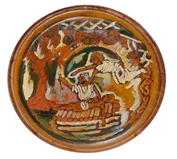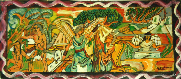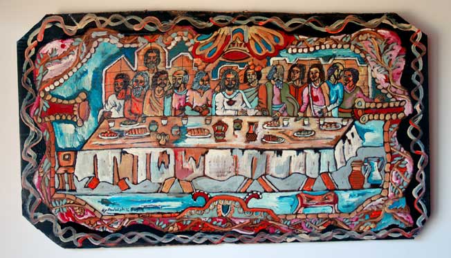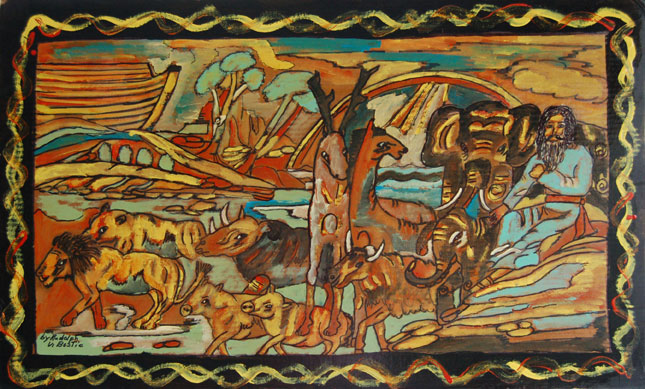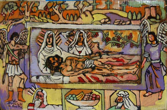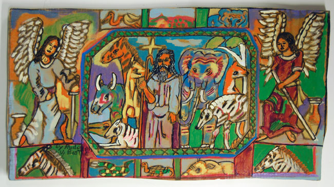 Cardboard Chronicles begins with The Creation of Adam, Adam and Eve Naming the Animals and Midnight in the Garden of Good and Evil, then turns to the colorful story of Noah. Many of his paintings portray the life of Christ. Comforting Mary (Annunciation) begins this journey, and Nativity with Angel portrays the incarnation of the Lord. Peace Be Still is a stunning interpretation of his encounter on the Sea of Galilee with his disciples, and The Last Supper is a real testimony to the influence of historical art on Bostic’s work. The show includes images of the death of Christ; Crucifixion, Pietà, and Lamentation/Two Women at Jesus’ Death. Angels Receive Orders from Jesus offers us the finale to Cardboard Chronicles: The Biblical Art of Rudolph Bostic.