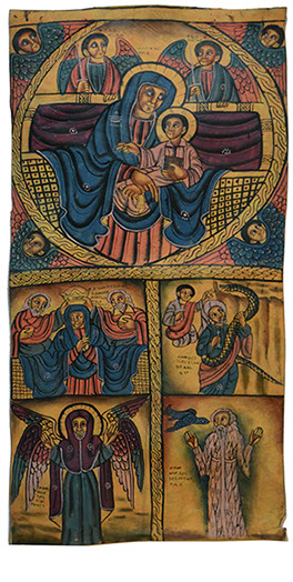 Most of the pieces in the show are the work of Ethiopian artists and artisans from the last thirty to fifty years, who carry on ancient forms of sacred art-making in the modern era. They include hammered metal processional and pectoral crosses, folding icons, and leather and parchment paintings on biblical themes in the style of traditional Ethiopian illuminated manuscript art. One of the highlights of the show is a hundred year old painting on leather of the Virgin Mary and Her Beloved Son surrounded by stories from the life of Jesus.
